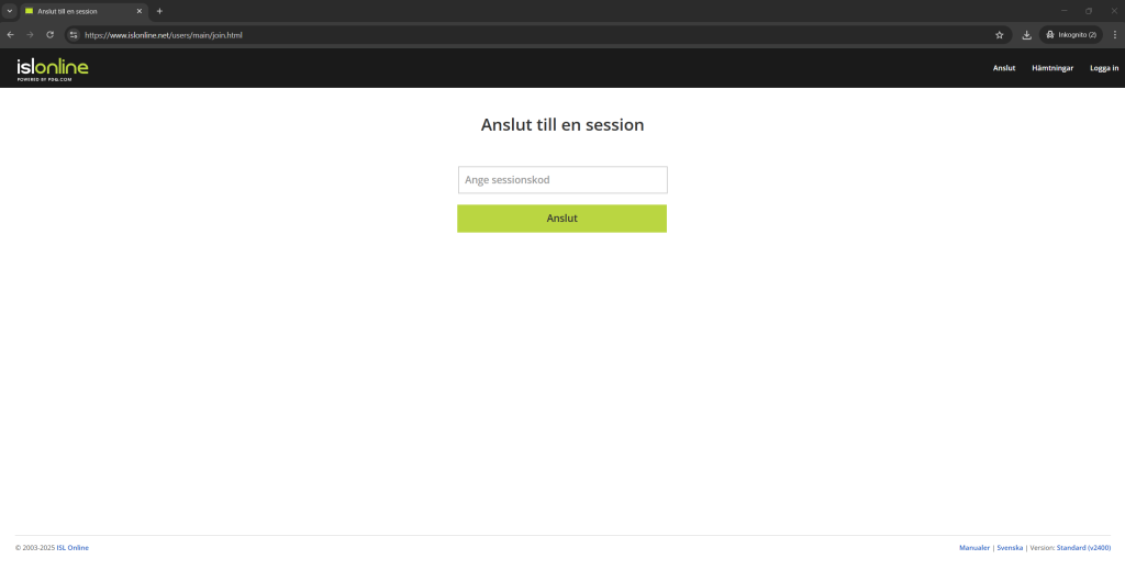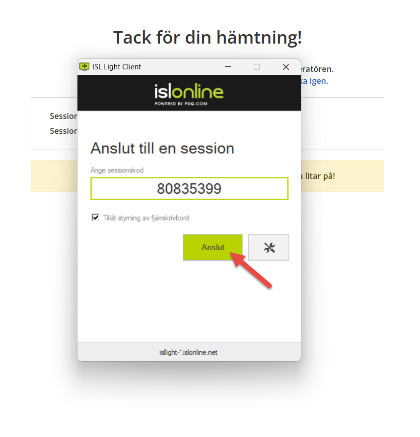 Ange sessionskoden som du får utav våra tekniker över telefon i fältet Ange sessionskod.