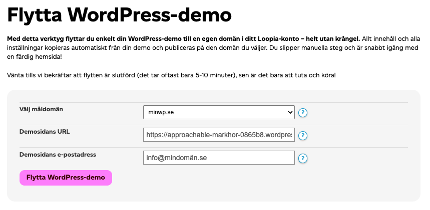 Här visar vi hur du snabbt och enkelt flyttar din WordPress-demo – skapad via LoopAI eller vårt vanliga demoverktyg – till en riktig domän i ditt Loopiakonto.