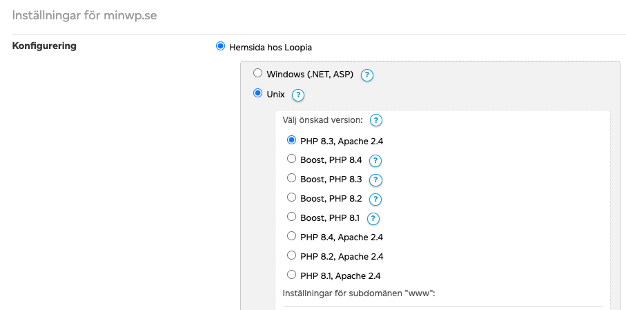 Börja med att kontrollera att domänen du ska flytta din WordPress till pekar mot våra UNIX-servrar. Det gör du genom att logga in i din Loopia Kundzon, scrolla ner till dina domännamn, klicka på domänen du vill flytta din sida till och välj sedan ”Hemsida hos Loopia–>Unix–>PHP 8.3 eller 8.4 (eller högre om det finns). Spara och vänta sen minst en timme för ändringen att propageras på webben och för att vi ska hinna skapa ett SSL/TLS-certifikat (https) till din sida.