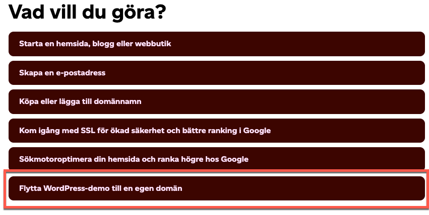 Efter cirka en timme så väljer du ”Flytta WordPress-demo till en egen domän” i Loopia Kundzonens toppmeny.